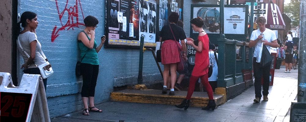 subway riders finishing up a call before heading into the subway or even fishing for service while underground.