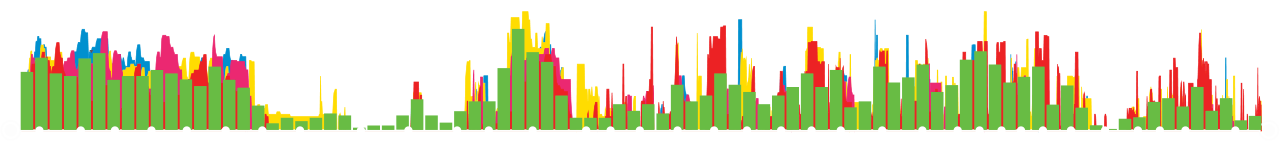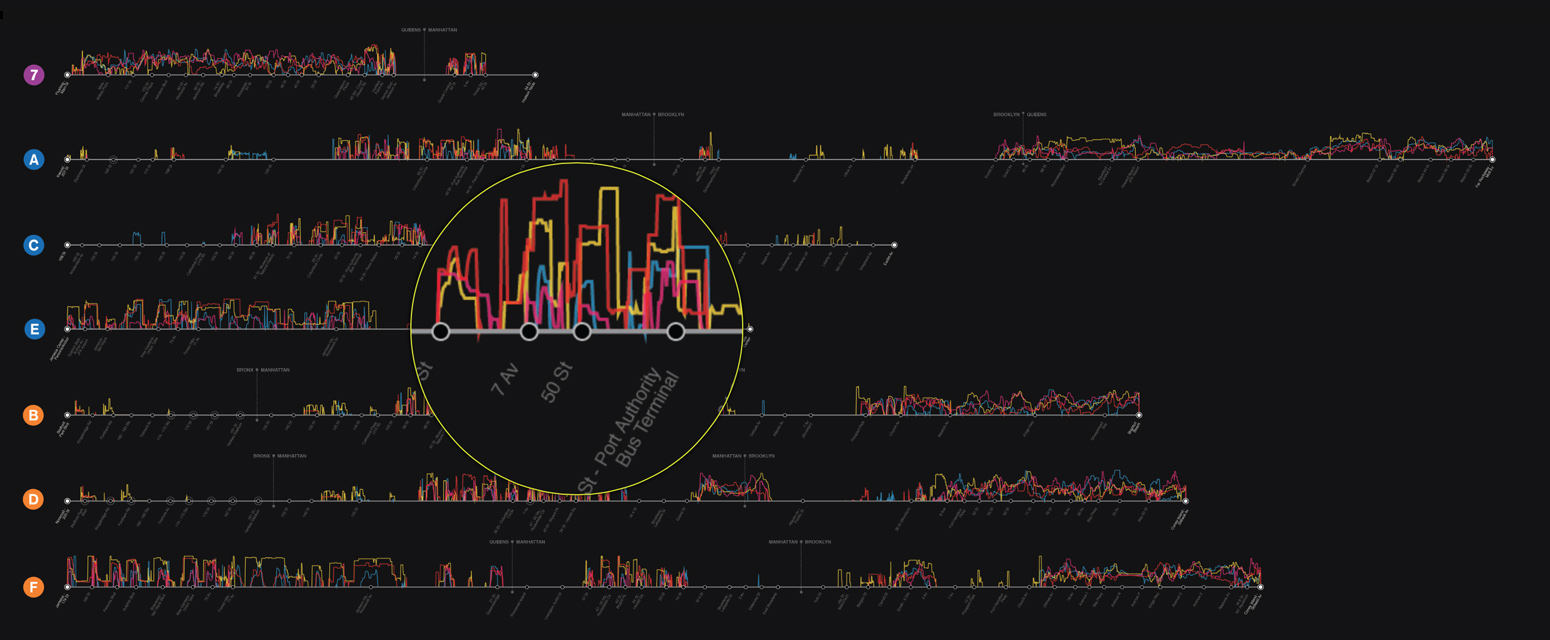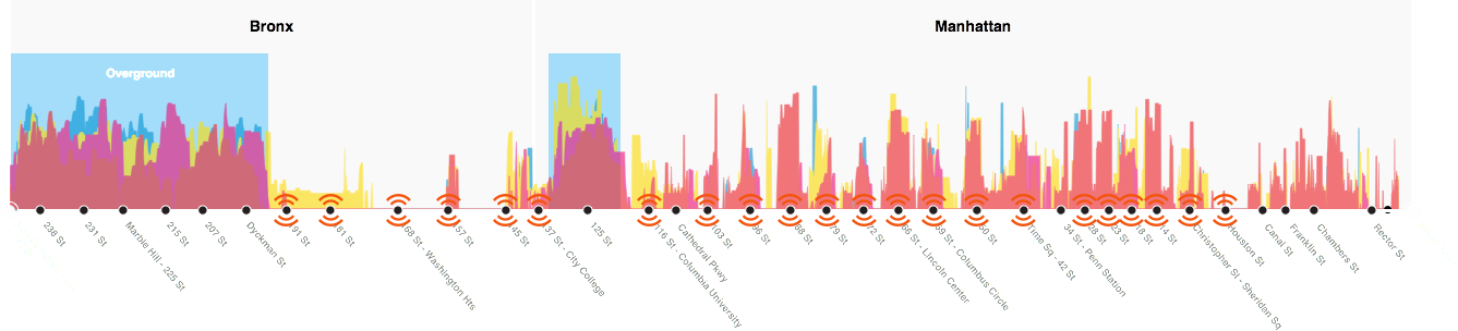 While data just by itself can seem mysterious, adding contextual information helps to understand it. Besides adding stations and boroughs to each of the lines we also indicated the WiFi enabled stations as well as underground and overground segments by hand. Below, the contextualized data of the 1 train.