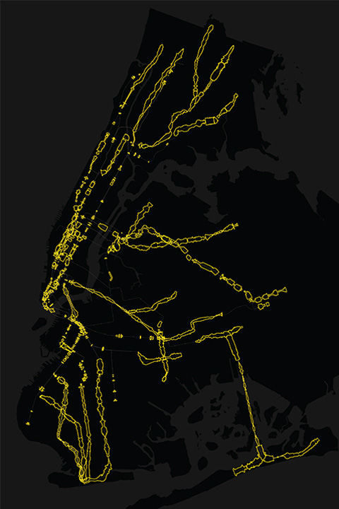 Over a period of two weeks in fall 2015, the Subspotting project logged the cell phone reception of New York City’s four major phone carriers along all 21 lines, 469 stations, and 660 miles of track covered by the MTA.